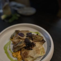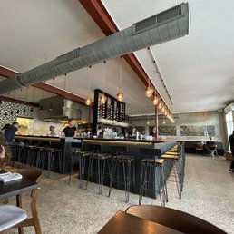 Service 4.5+ Food solid 4 We were thrilled that 2 bar seats were open last Friday when we called to check last minute after a disastrous visit to the Yuengling brewery. This place has been on my radar for awhile but since we live south of the Skyway, we are not usually in this area. Cool foodie modern industrial (aka very loud ) vibe, with a bar in the middle and tables with banquettes along the sides. Although we were seated at the bar, service did not falter. The server was extremely knowledgable. We loved the way she described every dish when it was served. Food was served and removed from behind us and fresh cutlery was provided without being asked. * thank you!!! Small plates- some are of a more shareable sizes than others. Disappointed about the lack of vegetarian and no vegan options. Server mentioned that the kitchen would modify. I selected the only 2 options and it worked out fine. Food was paced properly except for my husband's second course being served but mine was so delayed that he had finished and I was starting. Ooops- no excuse for that- very disappointing and lazy. Frankly, when paying $20- 30+ for a small plate, the wines by the glass ( example $19) could be lower to encourage more pairing opportunities. Winning dish- 3 large cobia collars with a sweet spicy sauce. Veggie pierogies - 2 good sized stick to your ribs recipe were described as having green garbanzo beans but they sure looked liked fresh peas to me. I love fresh peas and pea shoots that worked for me! Panzenella salad was disappointing - not much to it. Triple tail fish, $34, was served without any accompanying veggies. Dry and disappointing. Would recommend corvina, sea bass, or even cod. For those who like to watch some kitchen activities, you could request bar seating at the back of the u shaped bar where a chef creates some plates. Most of the kitchen action takes place in the kitchen at the back. Not quite visible unless you sneak a peek when going to one of the 2 unisex restrooms. We parked around the corner which worked out well. Not much outdoor signage so keep your eyes open! What set the service apart, one of the staff shared their staff recommendations of other places in the Tampa area for various meals or drinks. Love that hospitality! We will return and are looking forward to it!